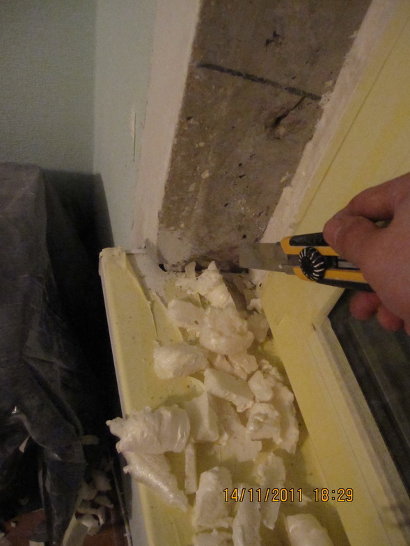 10. Срезать излишки пены можно будет только через полчаса после запенивания, сделать это можно с помощью строительного ножа.