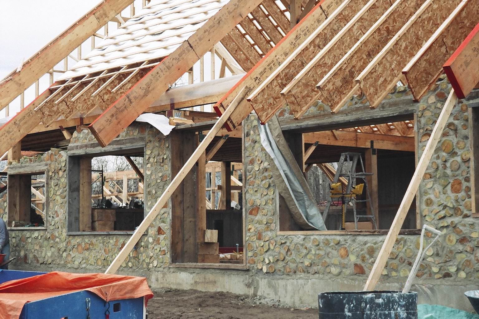 Затем при необходимости сооружают поддерживающий каркас. Для дома традиционной формы с углами и с массивной крышей без него не обойтись.После этого начинают класть слой за слоем чурки, скрепляя их и заполняя промежутки пластичным связующим (рецепты: глина, цемент, известь, наполнители — от соломы до хвои). В местах окон и дверей устанавливают каркасы и рамы. Во время строительства следует защищать конструкцию от дождей, для чего сооружается временный навес.