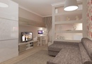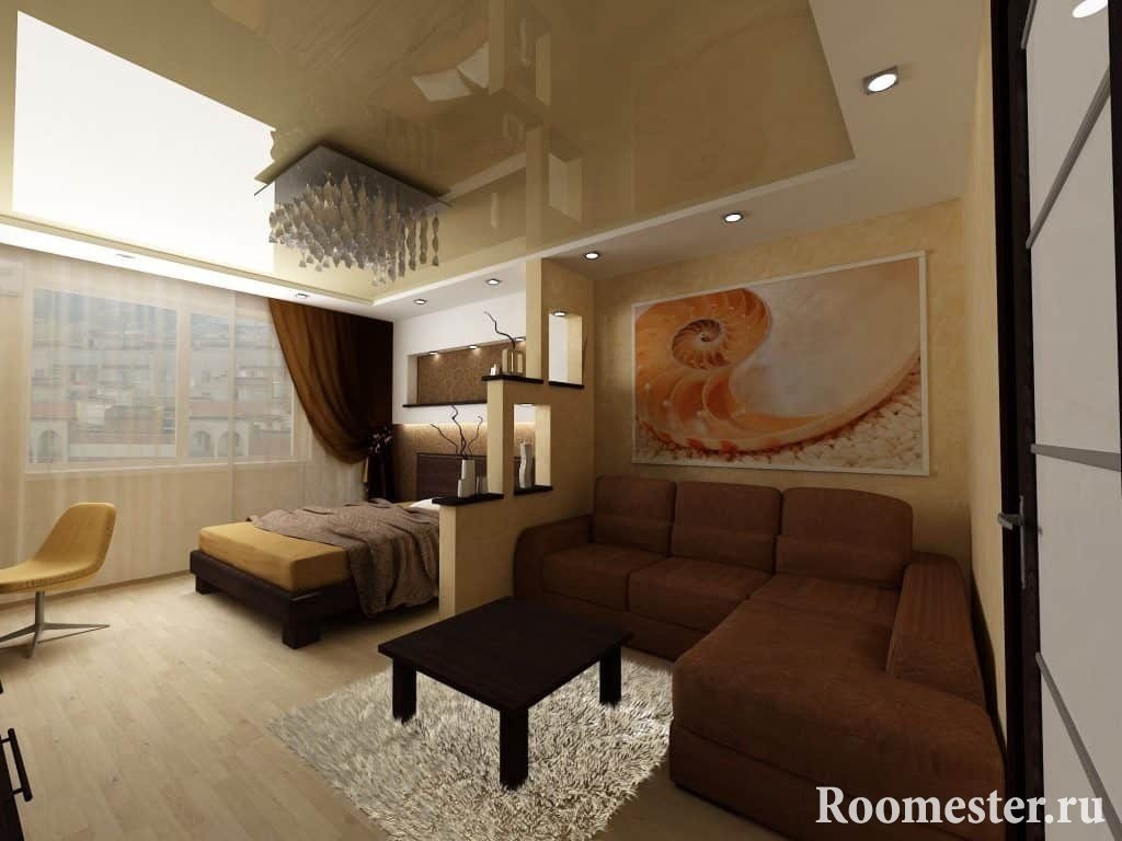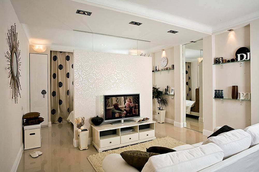 В гостиной части обязательно устанавливается диван. Можно выбрать как прямолинейную, так и угловую модель. Чаще всего диван ставят спинкой к спальне. Среди обладателей небольших гостиных популярностью пользуются трансформируемые диваны с отсеком для белья. В гостиной можно установить компактную модульную стенку или зеркальный шкаф-купе.