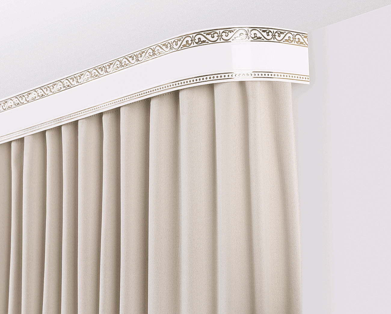 Стоимость их невысокая, материал для изготовления — используется пластик или алюминий. К преимуществам профильных карнизов также можно отнести их прочность и универсальность, они легко принимают любую форму и комплектуются дополнительными уголками. С ними в комплекте также идут заглушки, стопоры. Карниз можно декорировать разного рода рейками, таким образом можно закрыть видимую часть крепления шторы к профилю и украсить комнату дополнительно. Рейки бывают самых различных цветов и разного исполнения: с цветами, узорами, орнаментом или однотонные.