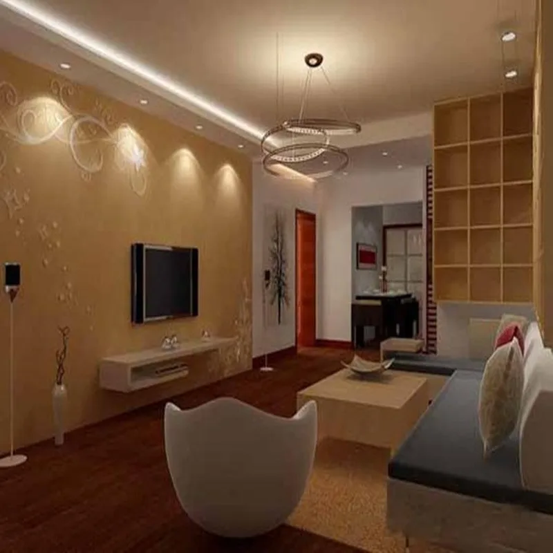 В интерьере гостиной с потолочной люстрой лучше установить источники света, имеющие слабую мощность. Таким образом при выключенной люстре от светильников будет исходить приятное, мягкое и приглушенное свечение. В данном случае точечные приборы можно расположить только по одной стороне потолка.
