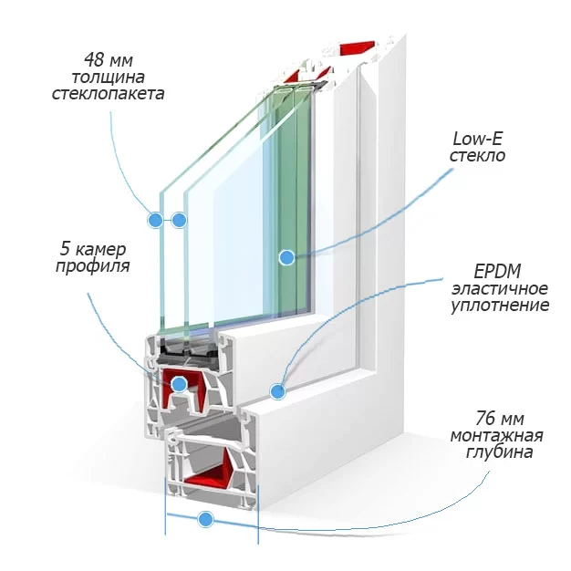 - Трехкамерный стеклопакет отлично подходит для северных регионов.