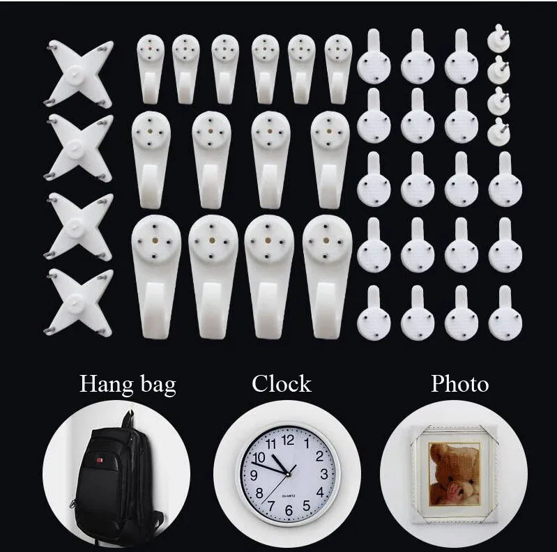 Такие крючки продаются в любом строительном магазине. Визуально они похожи на обычные. Основание сделано из пластика, также они имеют несколько тонких металлических шипов. Их нужно просто прибить молотком — шипы аккуратно «войдут» в стену, не оставляя глубоких следов.